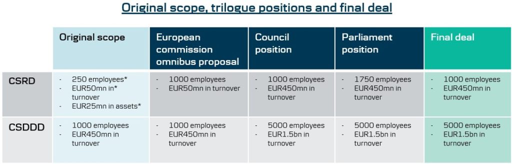 Omnibus 1 begränsar omfattningen av både CSRD och CSDDD kraftigt. Rapporteringskraven gäller nu de allra största företagen (se tabellen nedan).