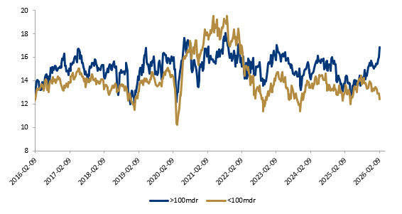 Ytterligare ett tema under månaden är den stora diskrepansen i avkastningen mellan småbolag och större bolag, som accelererade under månaden. En salig blandning mellan utflöden för småbolagsfonder, negativa revideringar, sämre exponering, och för högt ställda förväntningar kan nog svara på den ekvationen. Vi tror dock samtidigt att bågen har börjat spännas lite för hårt till fördel för de större bolagen, för är de rimligt att tro och anse att Sandvik (PE 28) har bättre förutsättningar än Lime (PE 19) att växa vinsten de kommande 5 åren? Vi tror inte riktigt det.