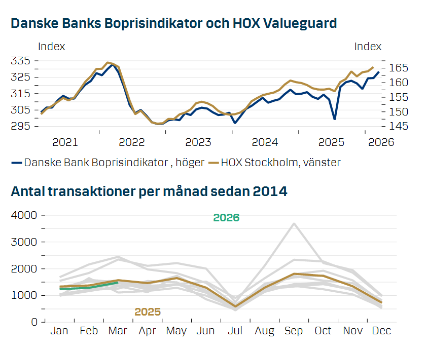 Kriget i Mellanöstern har drivit upp råvarupriser och stigande inflationsrisker. Danske Banks uppdaterade huvudscenario är att ECB och Riksbanken höjer räntan under våren för att motverka inflationsriskerna i spåren av stora utbudsstörningar samt slå vakt om inflationsmålet. Sammantaget bedöms Riksbanken höja räntan tre gånger till 2,5 procent i augusti för att sedan sänka räntan två gånger under andra halvåret 2027. Samtidigt förändras bolåne- och amorteringsreglerna den 1 april vilket, allt annat lika, väntas bidra till något högre bostadspriser.